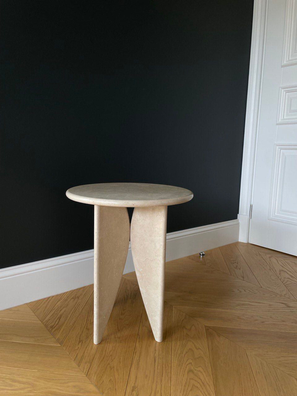 Круглий стіл зі світлого травертину з блочними ніжками.